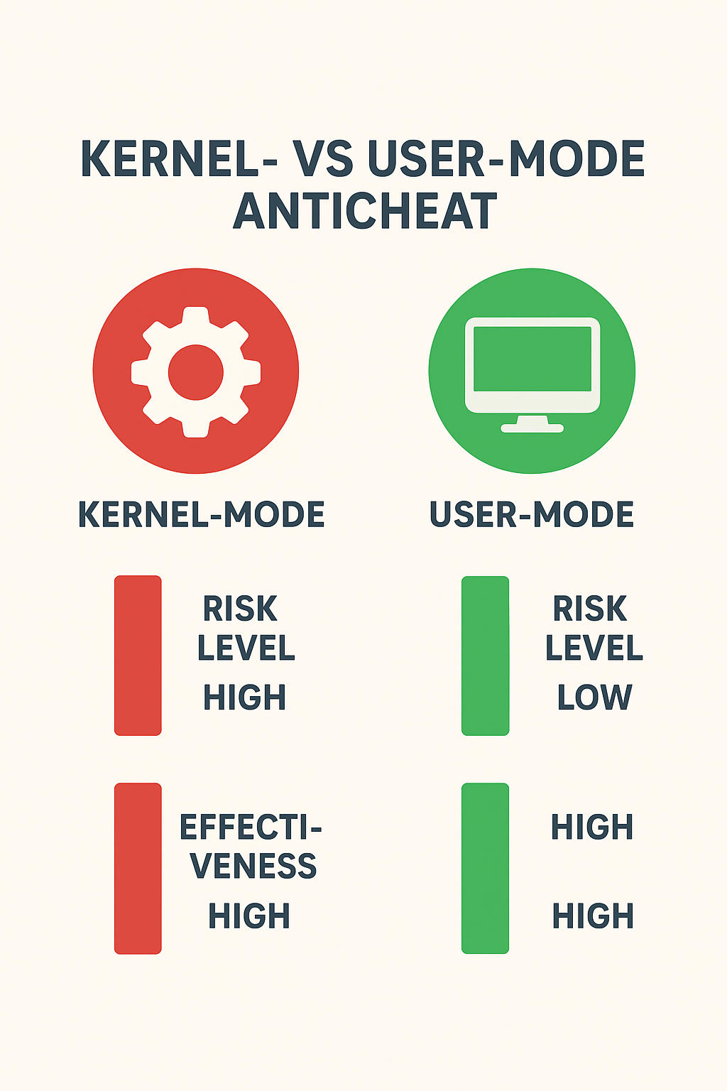 Tässä selkeä vertailu kernel-tasoisten ja user-mode-tasoisten anticheat-järjestelmien välillä — käytännön esimerkkien ja tietoturvariskien näkökulmasta:
