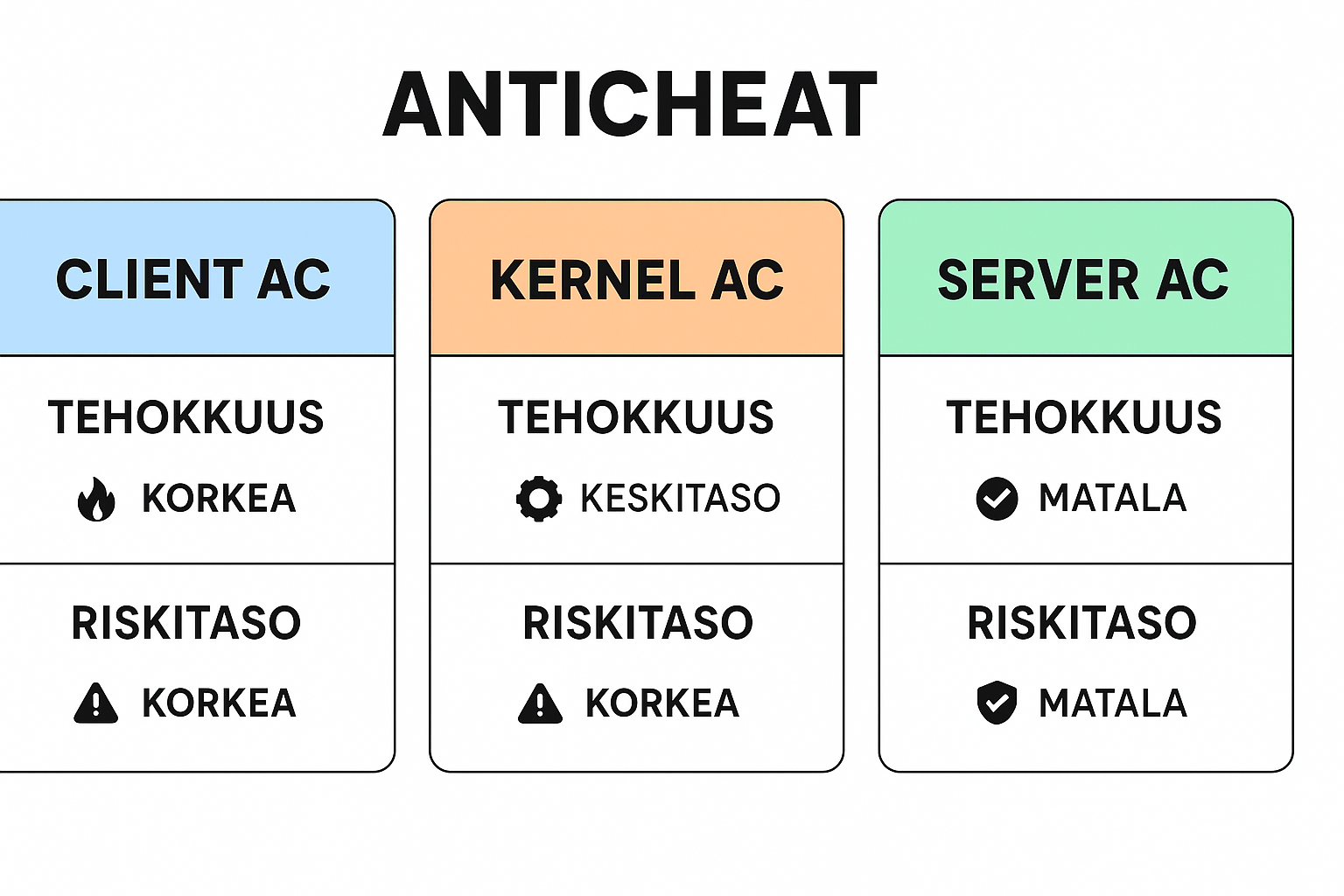 pienen vertailun kernel-tasoisen ja user-mode-anticheatin välillä (esim. EAC vs BattleEye vs Vanguard)? Se havainnollistaa hyvin riski–hyötysuhdetta.